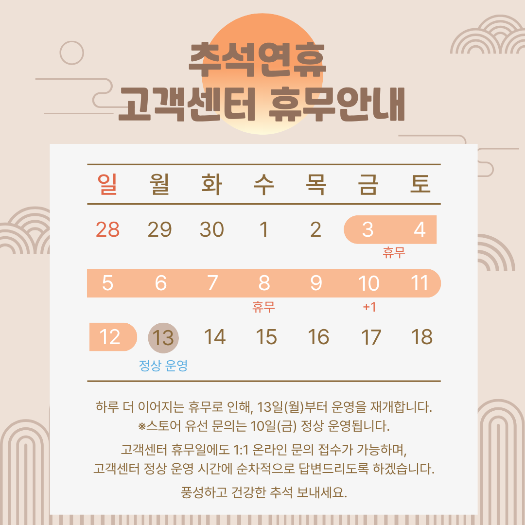 10월 3일(금)~12일(일) 추석연휴 고객센터 휴무안내